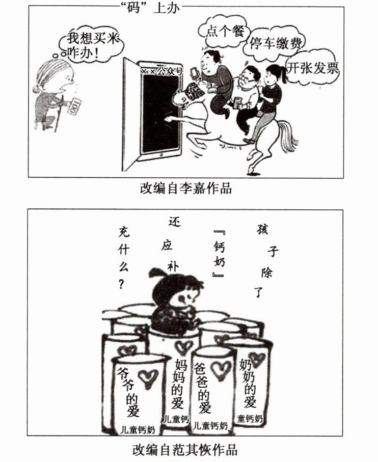 经典母题4. 题型 漫画型 设问要求 选项正确且符合寓意 排除错项 切题判断 两幅漫画主要讽刺千篇一律的现象,强调矛盾的普遍性,但忽视了矛盾的特殊性,也启示我们要善于从不同角度思考解决主体的利益需求→②③切题。漫画强调不要忽视矛盾的特殊性,未涉及意识的内容、意识的产生,这并不是两幅漫画的主旨→①不切题。漫画强调不要忽视矛盾的特殊性,未涉及真理的条件性、具体性,真理和谬误是否相伴而行→④不切题。答案:C