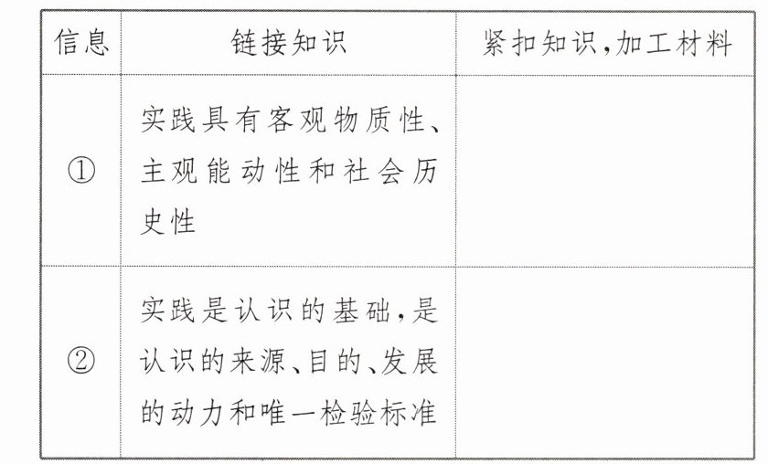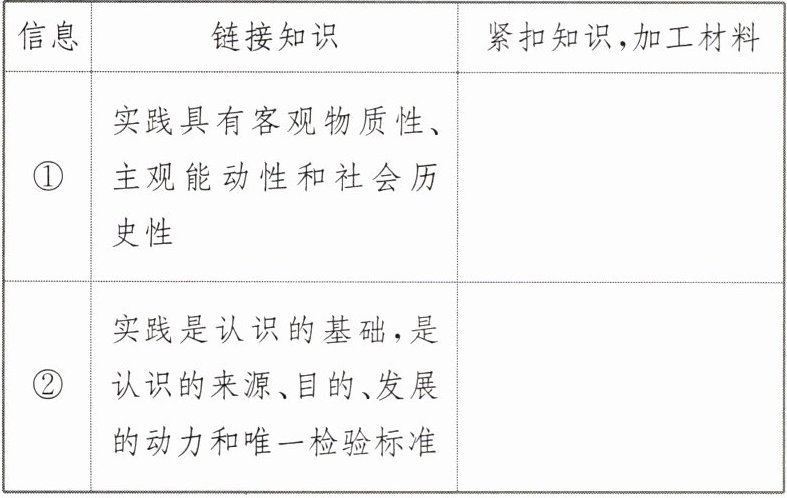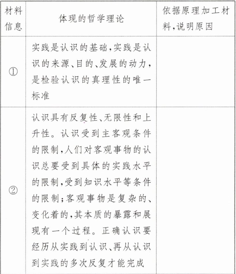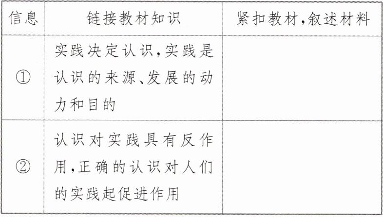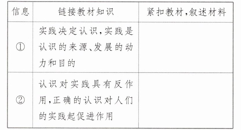 (2) 提取加工材料信息:①先梳理材料中有关认识论的知识点并用教材术语表述;②再结合材料逐条分析“审慎对待人类增强技术”的原因。
