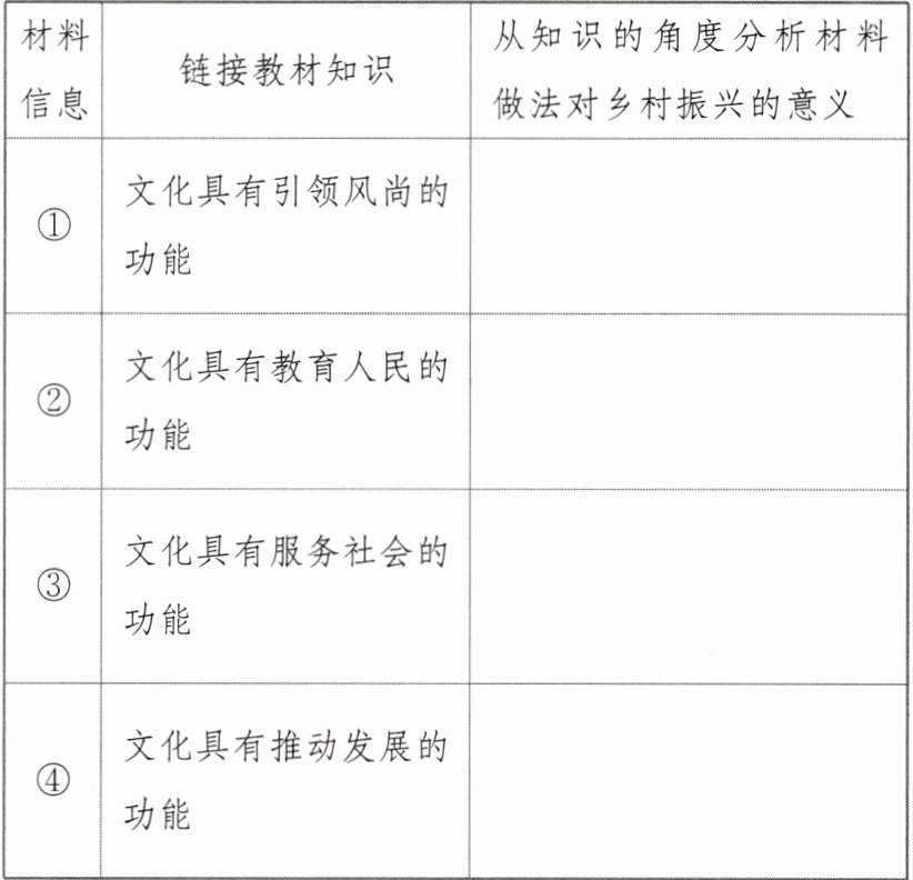 (1)①分析材料体现了哪些文化的功能;②运用相应的文化功能,逐条分析材料内容说明大南坡村的做法对乡村振兴的意义
