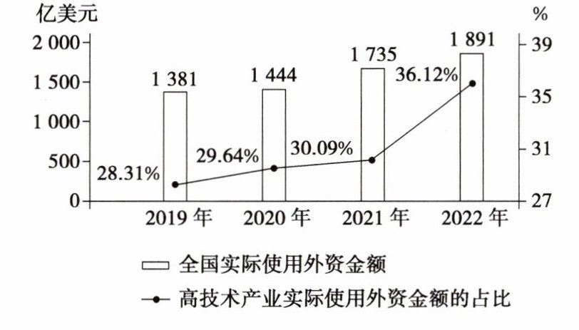 经典母题8:(2023·广东卷)2019-2022年中国实际使用外资情况见下图。