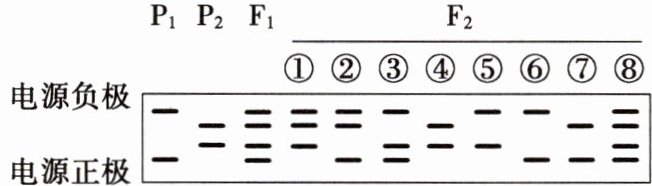 2.D 由题可知,这2对等位基因位于非同源染色体上,假设A/a为上部两条带的等位基因,B/b为下部两条带的等位基因,由电泳图可知P₁为AAbb,P₂为aaBB,F₁为AaBb,F₂中①AaBB②Aabb都为杂合子,③AABb占F₂的比例为$\frac{1}{8},$⑤AABB占F₂的比例为$\frac{1}{16},$A正确;电泳图中的F₂的基因型依次为:AaBB、Aabb、AABb、aaBB、AABB、AAbb、aabb、AaBb,未出现的基因型为aaBb,其个体PCR产物电泳结果有3条带,B正确;③AABb和⑦aabb杂交后代为Aabb、AaBb,其PCR产物电泳结果与②⑧电泳结果相同,C正确;①AaBB自交子代为$AABB(\frac{1}{4})、$$AaBB(\frac{1}{2})、$$aaBB(\frac{1}{4}),$其PCR产物电泳结果与④aaBB电泳结果相同的占$\frac{1}{4},$D错误。