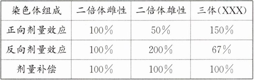 (2)正、反向剂量效应同时作用于常染色体和性染色体上的基因,在二者的影响下,三体果蝇性染色体上的基因表达量为 100%,但常染色体上的基因表达量下降至 67%
