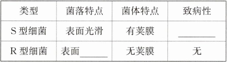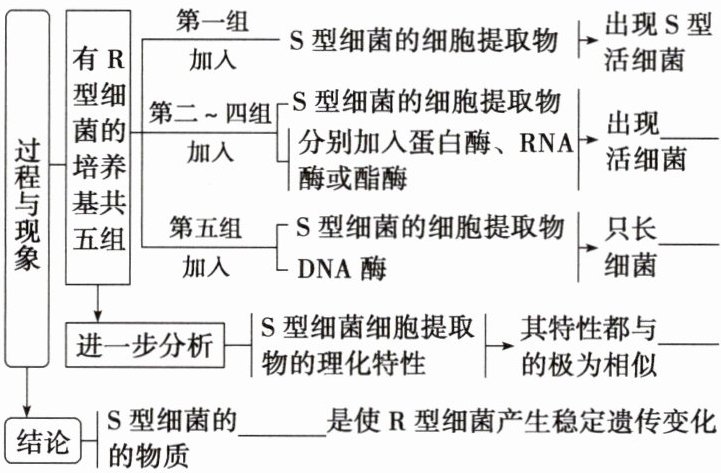 (2)①(先左后右)R 型活细胞 死亡 不死亡 ②R 型活细菌无致病性,S 型活细菌有致病性 加热致死的 S 型细菌无致病性 R 型活细菌可转化为 S 型活细菌 ③转化因子