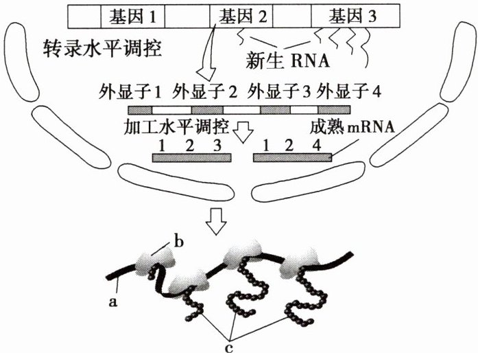 如图是真核细胞内基因表达的示意图。图中一个基因可由若干个外显子与内含子组成,基因被转录后经拼接加工把内含子转录出的片段切除,就形成了成熟 mRNA。则:
