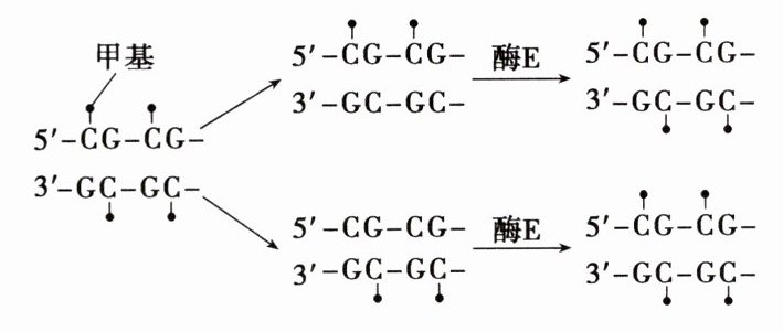 4C 由图可知,酶E的作用是催化DNA甲基化,A错误;DNA半保留复制的原料为四种脱氧核苷酸,没有甲基,B错误;“研究发现,50岁同卵双胞胎间基因组DNA甲基化的差异普遍比3岁同卵双胞胎间的差异大”,说明环境可能是引起DNA甲基化差异的重要因素,C正确;DNA甲基化不改变碱基序列,但会影响生物个体表型,D错误。