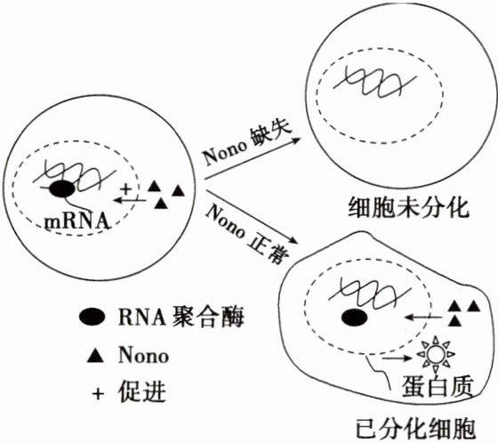 2C Nono是一类RNA结合蛋白,蛋白质的合成在细胞质中的核糖体上,据图可知Nono可进入细胞核中影响基因的表达,A正确;据图分析,Nono通过核孔进入细胞核中,与某种RNA结合而促进基因的表达过程,进而促进细胞分化,B正确;据图分析,若Nono正常,则其可能会促进某些基因的转录,使细胞分化,C错误;细胞分化是基因选择性表达的结果,D正确。