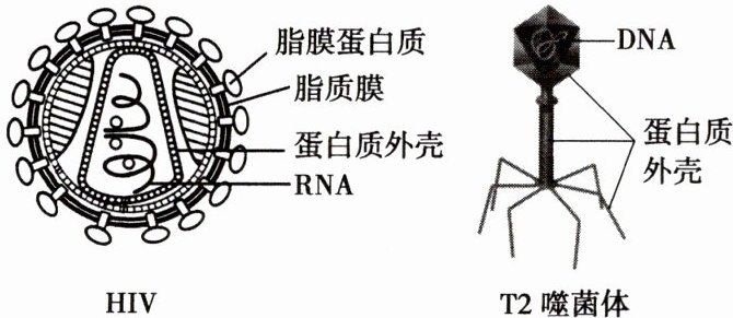 (2)HIV主要由RNA和蛋白质组成;T2噬菌体主要由DNA和蛋白质组成。这些成分都是利用宿主细胞的原料和相关结构合成的。