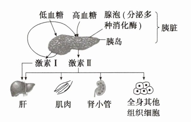 3.(1)①胰高血糖素和胰岛素;胰高血糖素由胰岛A细胞分泌,胰岛素由胰岛B细胞分泌。②胰岛B细胞受损导致胰岛素分泌量少;胰岛素受体减少。(2)①不一定,如一次性吃糖过多或肾小管重吸收障碍时均可导致尿液中葡萄糖含量高。②不能。因为这种糖尿病患者体内并不缺乏胰岛素,而是由胰岛素受体受损使胰岛素不能正常发挥功能所致。
