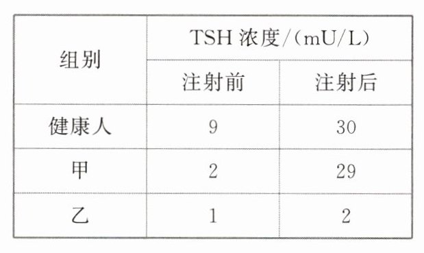 垂体和下丘脑发生病变都可引起甲状腺功能异常。现有甲、乙两人都表现为甲状腺激素水平低下,通过给两人注射适量的TRH,分别测定每个人注射前30min和注射后30min的TSH浓度来鉴别病变的部位是垂体还是下丘脑。测定结果如下表。
