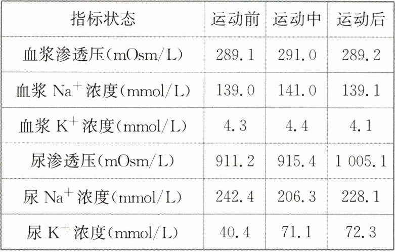 (4)为探究上表数据变化的原因,测定了自运动开始2 h内血浆中醛固酮(由____分泌)和抗利尿激素(由____释放)的浓度。结果发现,血浆中2种激素的浓度均呈现先上升后下降的趋势,分析激素浓度下降的可能原因包括____(答出2点即可)。