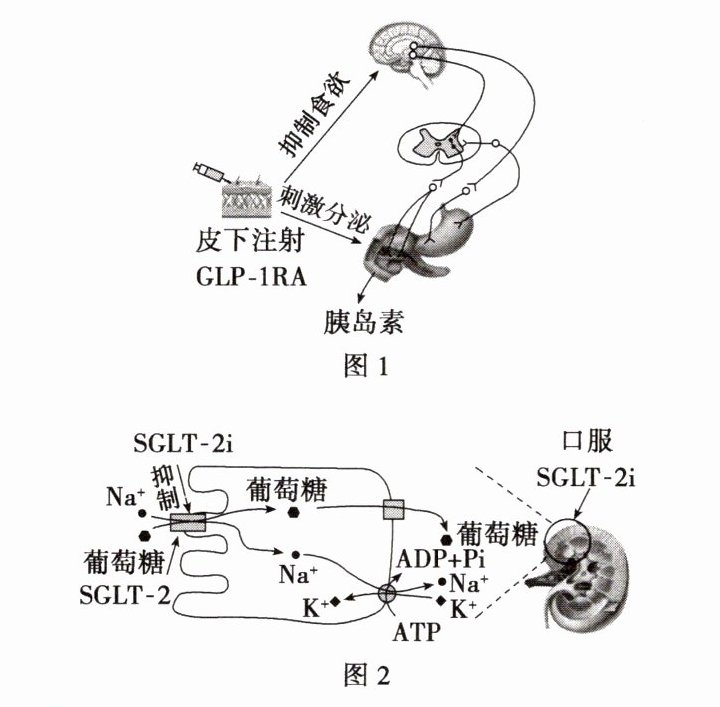 2. 胰高血糖素样肽-1(GLP-1)是由小肠细胞受营养刺激而分泌的多肽类激素,其受体分布在胰岛A、B细胞以及大脑神经细胞表面,通过抑制胰高血糖素释放、增加胰岛素分泌、影响动物的食欲来降低血糖。胰高血糖素样肽-1受体激动剂(GLP-1RA)的降糖机制如下图1;钠葡萄糖转运蛋白(SGLT-2)主要分布在肾小管,负责葡萄糖的重吸收,钠葡萄糖转运蛋白抑制剂(SGLT-2i)可以有效降血糖,其机制如下图2。回答下列问题。