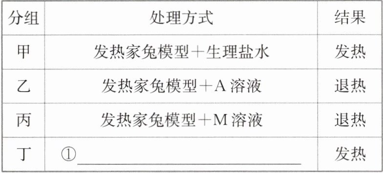 (3)若下丘脑体温调节中枢损毁,机体体温不能维持稳定。已知药物A作用于下丘脑体温调节中枢调控体温。现获得A的结构类似物M,为探究M是否也具有解热作用并通过影响下丘脑体温调节中枢调控体温,将A、M分别用生理盐水溶解后,用发热家兔模型进行了以下实验,请完善实验方案并写出实验结论。