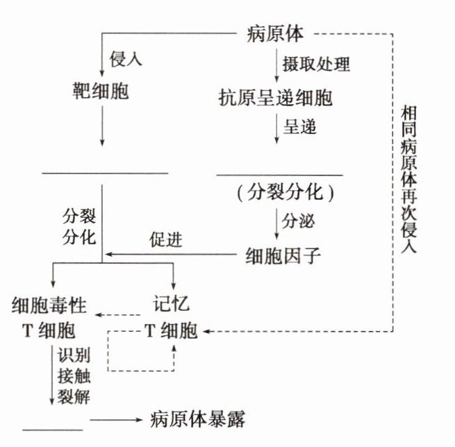 [提醒] ①细胞毒性 T 细胞的功能:分裂并分化,形成新的细胞毒性 T 细胞和记忆 T 细胞;识别并接触、裂解被同样病原体感染的靶细胞。②活化的细胞毒性 T 细胞与靶细胞接触并使其裂解、死亡属于细胞凋亡;若靶细胞遭病原体伤害致死,则属于细胞坏死。