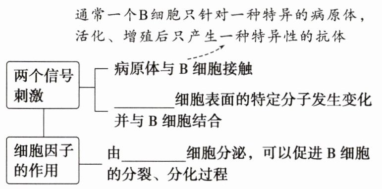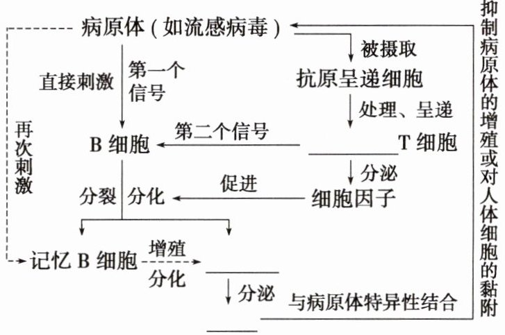 [提醒] ①体液免疫唯一能产生抗体的细胞是浆细胞;唯一没有识别功能的细胞是浆细胞;没有特异性识别功能的细胞是吞噬细胞。②一个 B 细胞只针对一种特异的病原体,活化、增殖后只产生一种特异性的抗体。③抗体可以随体液在全身循环并与相应病原体结合。在多数情况下,抗体与病原体结合后会发生进一步变化,如形成沉淀等,进而被其他免疫细胞吞噬消化。