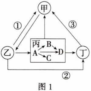 (1) 图1表示______过程示意图,图中一共有______条食物链,丙中B与D的种间关系是______,③代表的生理过程为______。