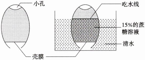 1. (2025·山东泰安模拟)将生鸡蛋的大头去掉蛋壳且保持壳膜完好,小头开个小孔让蛋清和蛋黄流出。将蛋壳内灌入一定量的质量浓度为15%的蔗糖溶液,然后放在盛有清水的烧杯中并用铅笔标上吃水线。下列分析正确的是 ( )