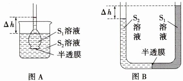 ①在溶质不能通过半透膜的情况下,若S1溶液浓度大于S2溶液浓度,则单位时间内由S2→S1的水分子数____由S1→S2的,表现为S1溶液液面上升。在Δh不变时,S1、S2溶液浓度的大小关系为S1____S2(填“>”“<”或“=”),此时半透膜两侧____(填“有”或“没有”)水分子的进出。
