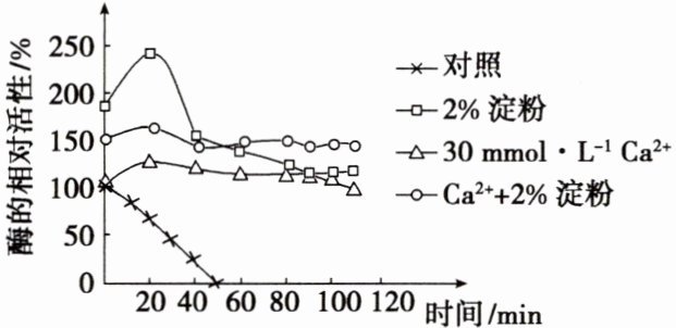 (2) α-淀粉酶是一种内切酶,以随机的方式从淀粉分子内部随机水解,β-淀粉酶则使淀粉从末端以两个单糖为单位进行水解。如图为根据β-淀粉酶在淀粉、Ca²⁺影响下的热稳定性的测定结果绘制的曲线图。