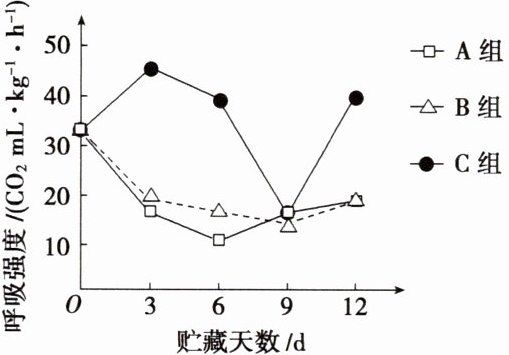 1. (2025·重庆模拟)某科研小组为探究高压静电场对黄瓜植株呼吸强度的影响,将植株分成三组,A、B 组分别将植株每天置于 $ 50 \, kV/m $、$ 100 \, kV/m $ 的高压静电场下培养 $ 1 $ 小时,C 组将植株放在无高压静电场的条件下培养。A、B、C 三组的温度控制在 $ 0 \, {\hspace{0pt}}^{\circ }\mathrm{C} $,实验结果如图所示。下列分析错误的是( )