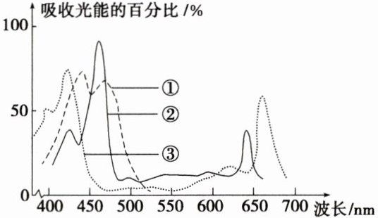 3.(2025·福建宁德模拟)高等植物的光合作用依赖光合色素。不同环境条件下,叶绿素 a 和叶绿素 b 之间可以相互转化,这种转化称为“叶绿素循环”。研究发现,在适当遮光条件下,叶绿素 a/叶绿素 b 的值会降低,以适应环境。图中②③是两种叶绿素的吸收光谱。下列关于叶绿素的叙述,错误的是( )