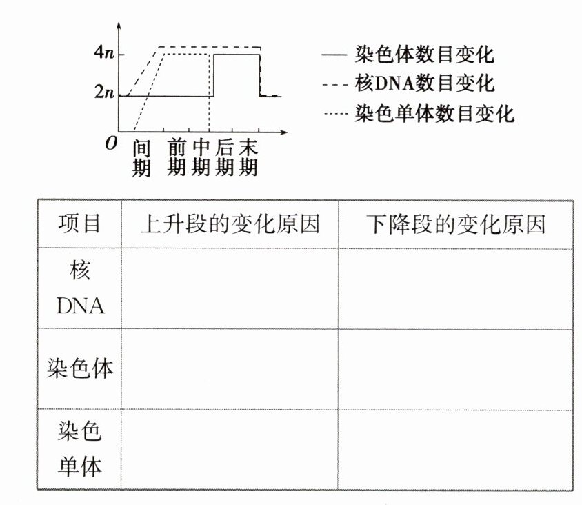 (1)分裂间期(S期)DNA复制,核DNA数目加倍 末期细胞一分为二,核DNA数目减半 后期着丝粒分裂,染色体数目加倍 末期细胞一分为二,染色体数目减半 分裂间期(S期)DNA复制,染色单体形成 后期着丝粒分裂,姐妹染色单体分离,染色单体消失