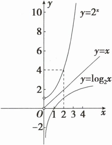 问题. 观察函数$y = x$,$y = 2^x$,$y = \log_2 x$在区间$(0, +\infty)$上的图象,思考以下两个问题: