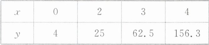 根据题意有$ \begin{cases} ka^0 = 4, \\ ka^2 = 25, \end{cases} $解得$ \begin{cases} a = \frac{5}{2}, \\ k = 4, \end{cases} $所以$ y = 4 × \left( \frac{5}{2} \right)^x, x \in \mathbf{N} $.
