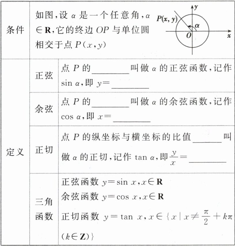 纵坐标$y$ $\sin\alpha$ 横坐标$x$ $\cos\alpha$ $\frac{y}{x}$ $\tan\alpha(x\neq 0)$