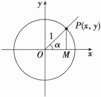 问题 1. 如图,锐角$\alpha$的终边与单位圆的交点是$P(x,y)$,你能否用点$P$的坐标表示$\sin\alpha,\cos\alpha,\tan\alpha$?这一结论能否推广到$\alpha$是任意角时的情形呢?