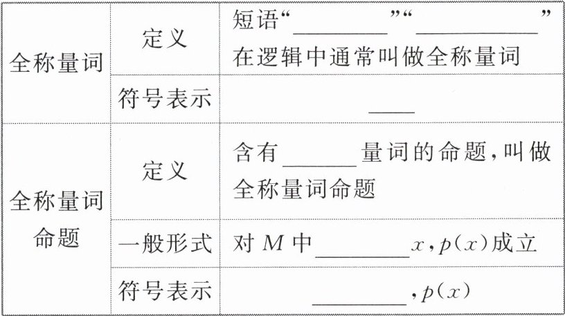 [微提醒] 有些全称量词命题中的全称量词是省略的,理解时需要把它补充出来,例如:命题“平行四边形的对角线互相平分”应理解为“所有的平行四边形的对角线都互相平分”.