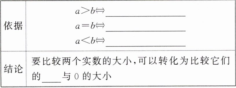 若$ a - b = 0 $,则$ a = b $;若$ a - b < 0 $,则$ a < b $。