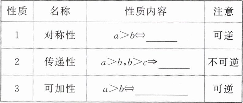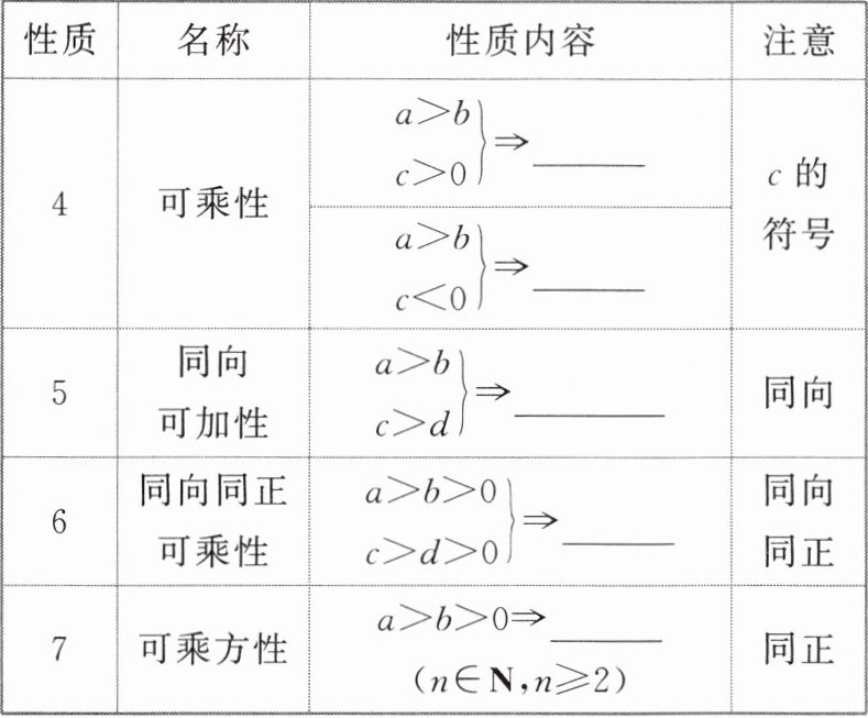 [微提醒](1)性质 3(即可加性)是移项法则“不等式中任何一项的符号变成相反的符号后,可以把它从一边移到另一边”的依据.(2)性质 4(即可乘性)在使用中要特别注意研究“乘数的符号”.(3)性质 5(即同向可加性),即“同向不等式只能相加,不等号方向不变,不能相减”.(4)性质 7(即可乘方性)的拓展:$a > b > 0 \Rightarrow \sqrt[n]{a} > \sqrt[n]{b} (n \in \mathbb{N}, n \geq 2)$.