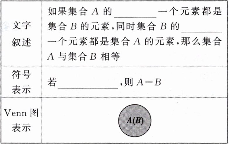 文字叙述:如果集合$A$的每一个元素都是集合$B$的元素,同时集合$B$的每一个元素都是集合$A$的元素,那么集合$A$与集合$B$相等。