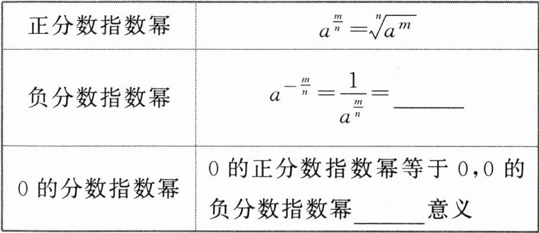 [微提醒] (1) 分数指数幂$a^{\frac{m}{n}}$不可理解为$\frac{m}{n}$个$a$相乘,它是根式的一种写法. (2) 正数的负分数指数幂总表示正数,而不是负数.