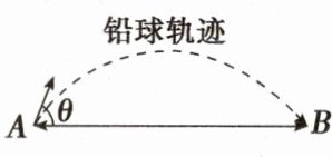如图所示,某同学在操场上练习投掷铅球,将铅球从某一水平面的$A$点以仰角$\theta$斜向上抛出,铅球运动过程中经过同一水平面上与$A$点相距$10\sqrt{3}$ m的$B$点,且最高点距$AB$水平面$5$ m。忽略空气阻力($g = 10$ m/s²),则( )