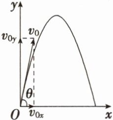 如果斜抛运动的初速度$v_0$与水平方向的夹角为$\theta$,则水平方向分速度$v_{0x}=$______,竖直方向分速度$v_{0y}=$______。