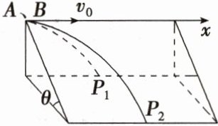 BD $A$做平抛运动,运动的时间$t_{A} = \sqrt{\frac{2h}{g}}$,$B$做类平抛运动,运动的时间$t_{B} = \sqrt{\frac{2h}{g \sin^{2} \theta}}$,可知$B$运动的时间长,A错误,B正确;$A$的水平位移$x_{A} = v_{0} \sqrt{\frac{2h}{g}}$,$B$的水平位移$x_{B} = v_{0} \sqrt{\frac{2h}{g \sin^{2} \theta}}$,可知$P_{2}$在$x$轴上较远,C错误,D正确。