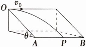 如图所示,将小球以一定的初速度 $ v_0 $ 从倾角为 $ \theta $ 的固定光滑斜面上的 $ O $ 点水平抛出的运动轨迹如图所示,落地点为 $ P $,$ O $ 点离地高度为 $ h $,重力加速度为 $ g $。