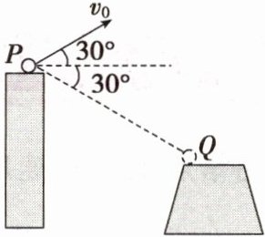 真题4(多选)(2024·山东高考)如图所示,工程队向峡谷对岸平台抛射重物,初速度$v_0$大小为$20m/s$,与水平方向的夹角为$30^{\circ}$,抛出点$P$和落点$Q$的连线与水平方向夹角为$30^{\circ}$,重力加速度大小取$10m/s^2$,忽略空气阻力。重物在此运动过程中,下列说法正确的是( )