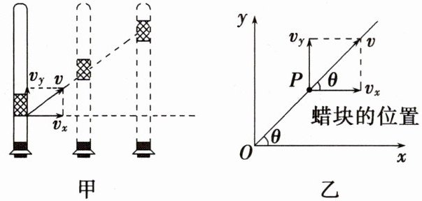 教材 6 - 8 页“观察蜡块的运动”演示中,如图甲所示,蜡块沿玻璃管匀速上升的同时,玻璃管沿水平方向向右匀速移动,蜡块实际运动轨迹是向右上方运动。