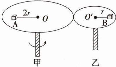 对点练.(2025·安徽马鞍山二中期中)如图所示,甲、乙两水平圆盘紧靠在一起,甲圆盘为主动轮,乙靠摩擦随甲转动且无相对滑动。甲圆盘与乙圆盘的半径之比为$R_{甲}:R_{乙} = 2:1$,两圆盘和小物体$A$、$B$之间的动摩擦因数$\mu_{A}:\mu_{B} = 1:2$,$A$、$B$的质量相同,$A$距$O$点为$2r$,$B$距$O'$点为$r$,当甲缓慢转动起来且转速慢慢增加时( )