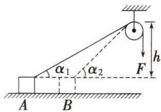 例 4 某人利用如图所示的装置,用 $ 100 \, N $ 的恒力 $ F $ 作用于不计质量的细绳的一端,将物体从水平面上的 $ A $ 点移到 $ B $ 点。已知 $ \alpha_1 = 30° $,$ \alpha_2 = 37° $,$ h = 1.5 \, m $,不计滑轮质量及滑轮与轴间的摩擦。求绳的拉力对物体所做的功($ \sin 37° = 0.6 $,$ \cos 37° = 0.8 $)。