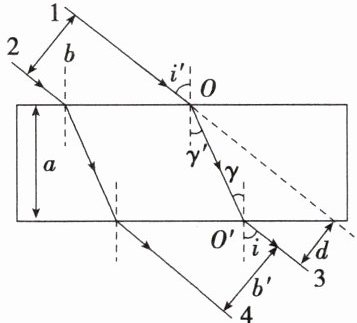 任务3.出射光线3、4平行,入射光线1、2间距$b$与出射光线3、4间距$b'$相等。