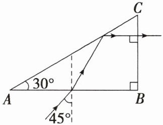 针对练 1. 如图所示,在空气中有一直角棱镜 $ ABC $,$ AC $ 边涂有反射膜,$ \angle A = 30 ^ { \circ } $,一束单色光从 $ AB $ 边射入棱镜,入射角为 $ 45 ^ { \circ } $,最终垂直于 $ BC $ 边射出,则该棱镜的折射率为( )