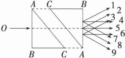 如图所示,两块相同的玻璃直角三棱镜ABC,两者的AC面是平行放置的,在它们之间是均匀的未知透明介质。一单色细光束O垂直于AB面入射,在图示的出射光线中( )