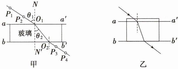 (2)乙同学在画完边界 $ aa' $ 时,不小心将玻璃砖向上平移了一小段距离,然后画出下边界 $ bb' $,导致两边界间距略小于玻璃砖宽度,如图乙所示,则他测得的折射率与真实值相比 ________(填“偏大”“偏小”“不变”或“无法确定”)。