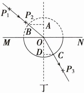 (4)另一个实验小组使用半圆柱形玻璃砖测定玻璃的折射率。如图丁所示,在平铺的白纸上垂直纸面插大头针 $ P_1 $、$ P_2 $ 确定入射光线,并让入射光线过圆心 $ O $,在玻璃砖(图中实线部分)另一侧垂直纸面插大头针 $ P_3 $,使 $ P_3 $ 挡住 $ P_1 $、$ P_2 $,连接 $ OP_3 $,图中 $ MN $ 为分界线,虚线半圆与玻璃砖对称,$ B $、$ C $ 分别是入射光线、折射光线与圆的交点,$ AB $、$ CD $ 均垂直于法线并分别交法线于 $ A $、$ D $ 点。