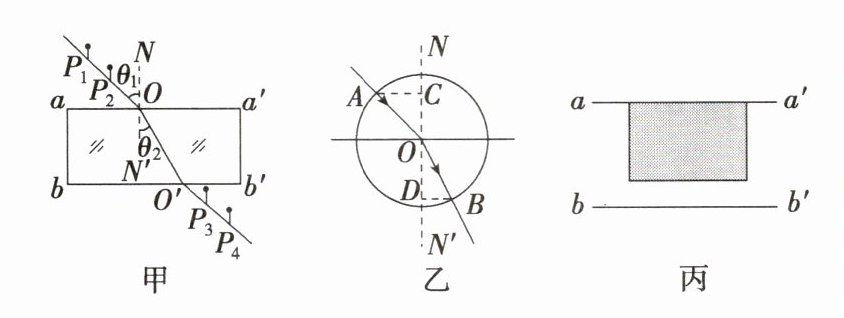 (2)某同学在图甲的基础上,以入射点 $ O $ 为圆心作圆,与入射光线 $ P_1O $、折射光线 $ OO' $ 的延长线分别交于 $ A $、$ B $ 两点,再过 $ A $、$ B $ 两点作法线 $ NN' $ 的垂线,垂足分别为 $ C $、$ D $ 点,如图乙所示,则玻璃的折射率 $ n = $_________$ $(用图中线段的字母表示)。