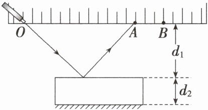 针对练 某同学测量玻璃砖的折射率,准备了下列器材:激光笔、直尺、刻度尺、一面镀有反射膜的平行玻璃砖。如图所示,直尺与玻璃砖平行放置,激光笔发出的一束激光从直尺上 $ O $ 点射向玻璃砖表面,在直尺上观察到 $ A $、$ B $ 两个光点,读出 $ OA $ 间的距离为 $ 20.00 \, cm $,$ AB $ 间的距离为 $ 6.00 \, cm $,测得图中直尺到玻璃砖上表面距离 $ d_1 = 10.00 \, cm $,玻璃砖厚度 $ d_2 = 4.00 \, cm $。玻璃砖的折射率 $ n = $_________$ $,光在玻璃中的传播速度 $ v = $_________$ \, m/s $。(光在真空中的传播速度 $ c = 3.0 × 10^8 \, m/s $,结果均保留 2 位有效数字)