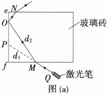 ②移走玻璃砖,在白纸上描绘玻璃砖的边界和激光的光路,作 $ QM $ 连线的延长线与 $ ef $ 面的边界交于 $ P $ 点,如图(a)所示;